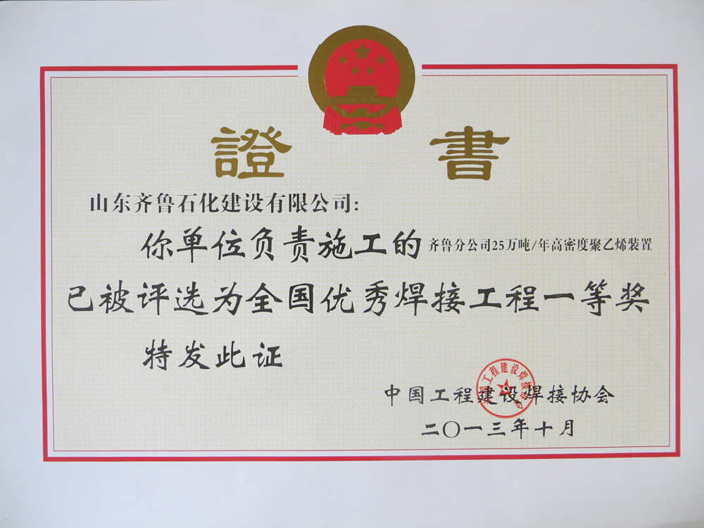 全國優(yōu)質(zhì)焊接工程-齊魯分公司25萬噸/年高密度聚乙烯裝置